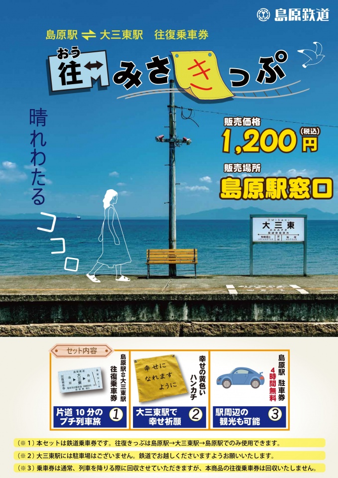 We have prepared a very economical ticket set that includes a round-trip ticket from Shimabara Station to Daisanto Station, a "Shiawase no Kiiroi Handkerchief" and a parking ticket that allows use of the Shimabara Station parking lot!
